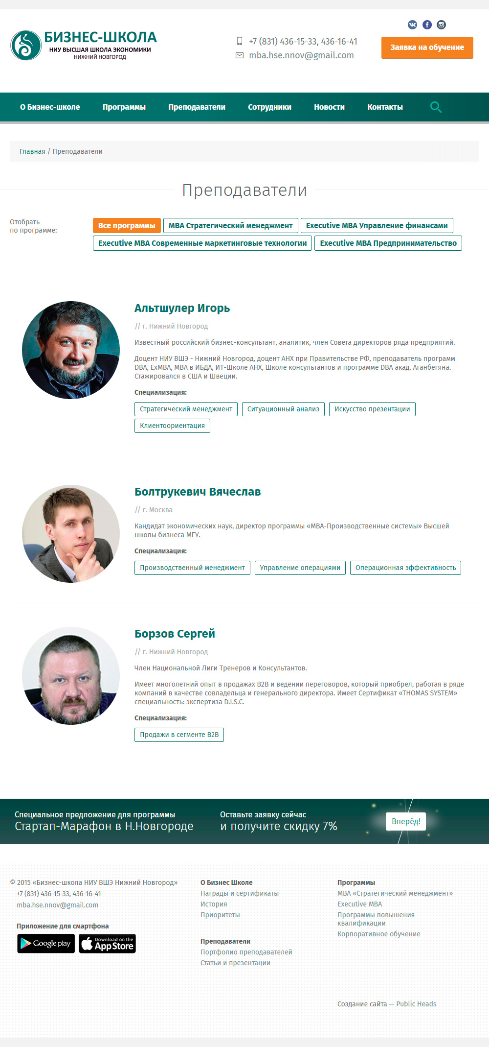 Спокойный сдержанный стиль, четкая структура, акцент на контенте — все это отражает и дополняет основные принципы работы Бизнес-школы: использование новейших образовательных технологий, профессионализм и индивидуальный подход в процессе обучения.